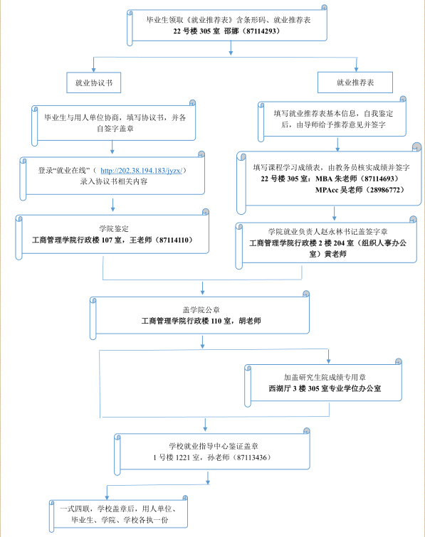 2.每个毕业生只能领取一份就业协议书、就业推荐表。因而建议使用推荐表复印件求职,待完全确定就业意愿后,才将原件交予就业单位。该表对毕业生和单位都很重要,若须更改推荐表内容,须将原推荐表退回MBA/MPAcc中心,办理登记手续后方可领取新的推荐表;