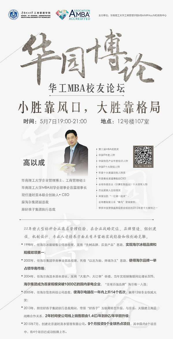 “华园博论”是华南理工大学MBA同学会重磅打造的MBA校友论坛系列活动,首期论坛即将上演!重量级MBA校友高以成先生,莅临发声!