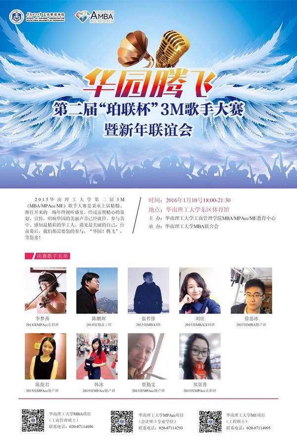 华南理工大学第二届3M(MBA/MPAcc/ME)歌手大赛是秉承上届精髓、继往开来的一场年终视听盛宴。经过前期精心的策划、宣传,唱响华园的魅力声音已经就位。