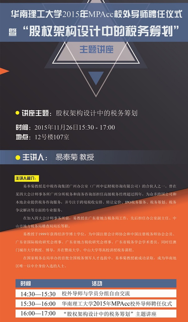 【活动预告】2015年MPAcc校外导师聘任仪式暨“股权架构设计中的税务筹划”主题讲座