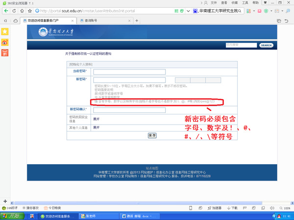 1. 办公门户的登录页面可以点击学校主页上方的“办公门户”(http://portal.scut.edu.cn/cmstar/index.portal)。第一次登录办公门户的用户会被要求强制修改密码,新密码复杂度需要为“强”方可保存新密码。