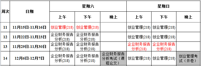 因李映照老师时间问题,现将本周六(11月15日)《企业财务报告分析》上课时间与11月30日《创业管理》上课时间互换,上课地点不变。请同学们做好相应准备。详情如下: