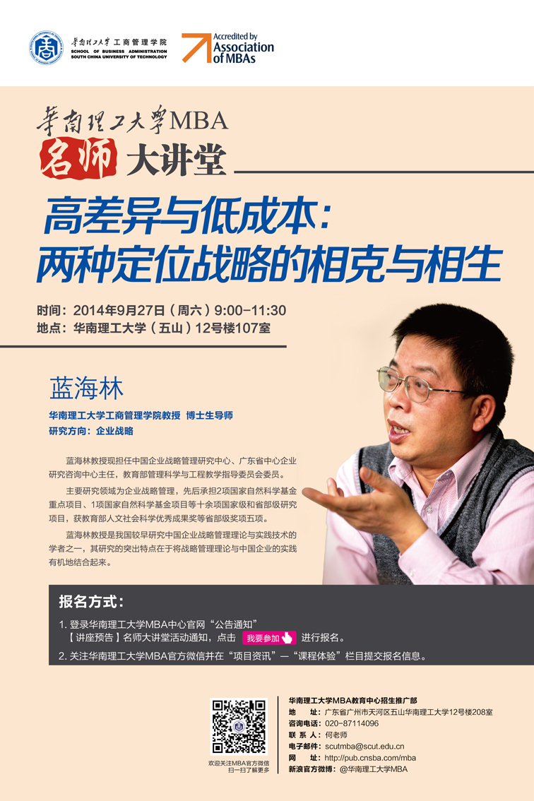 【讲座预告】MBA名师大讲堂—高差异与低成本:两种定位战略的相克与相生