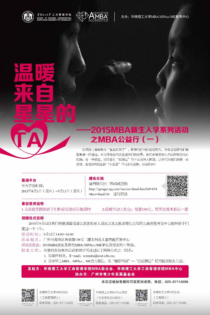 在华工MBA过去的22年间, 我们曾在救助贫困山区的路途中留下了我们的足迹; 曾在汶川地震的救援中贡献力量。 华工MBA肩负的不仅是企业管理精英的培育,更有社会正能量的传播。 2015华工MBA公益行,让我们共同为“星星”儿童点亮一盏明灯!